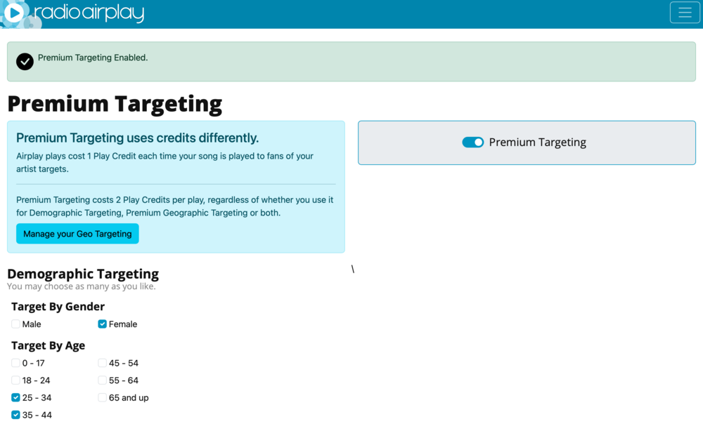 When Premium Targeting is enabled 1 premium targeted play will cost 2 play credits. With Premium Targeting we will guarantee that your music is played only to the listeners in your specifically targeted region(s) and demographic/age group(s).