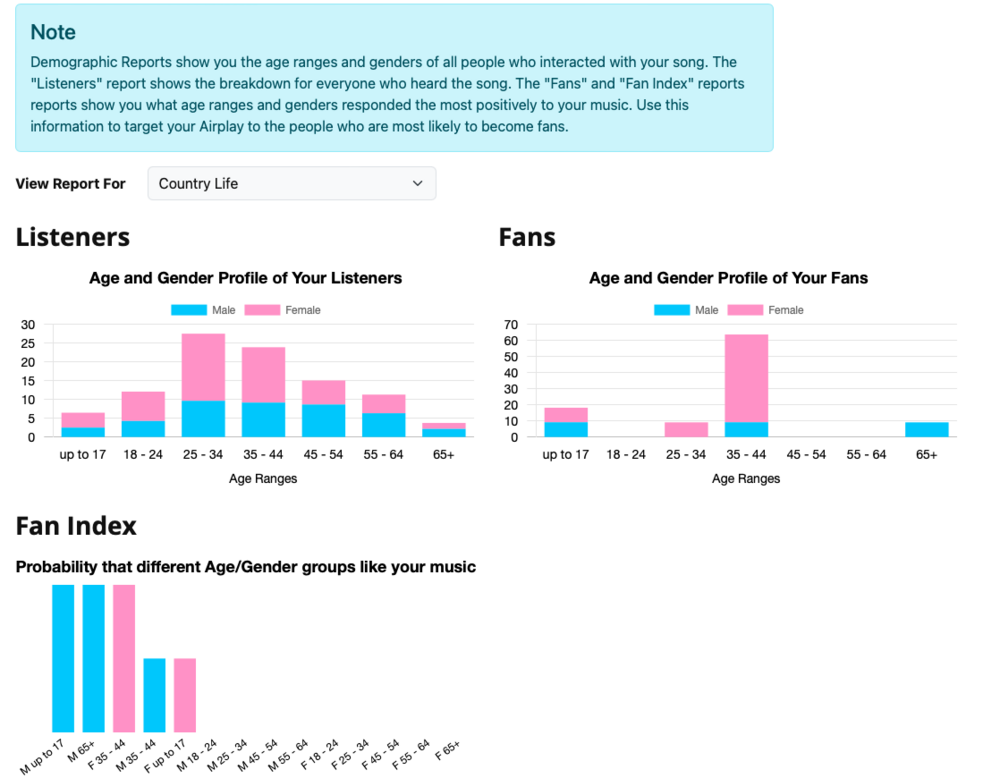 Demographic Reports show you the age ranges and genders of all people who interacted with your song. The "Listeners" report shows the breakdown for everyone who heard the song. The "Fans" and "Fan Index" reports reports show you what age ranges and genders responded the most positively to your music. Use this information to target your Airplay to the people who are most likely to become fans.